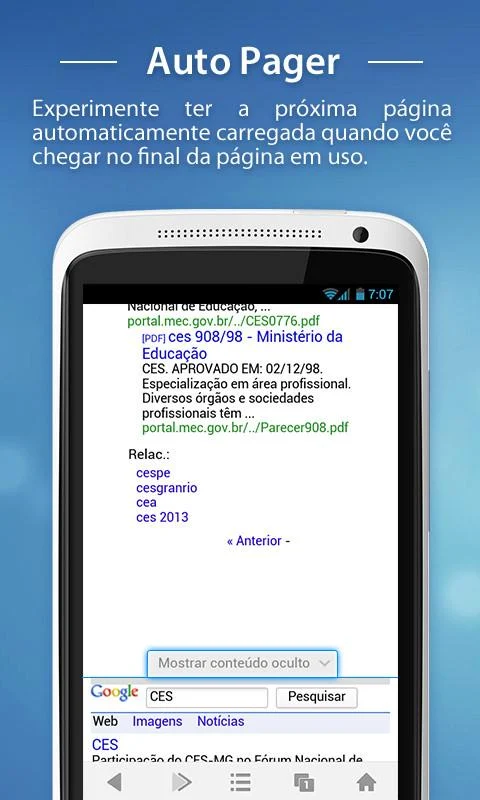 Experimente ter a próxima página automaticamente carregada quando você chegar no fim da página em uso. Funciona com a Versão Leve em sites como Google, Twitter, Facebook e muito mais.